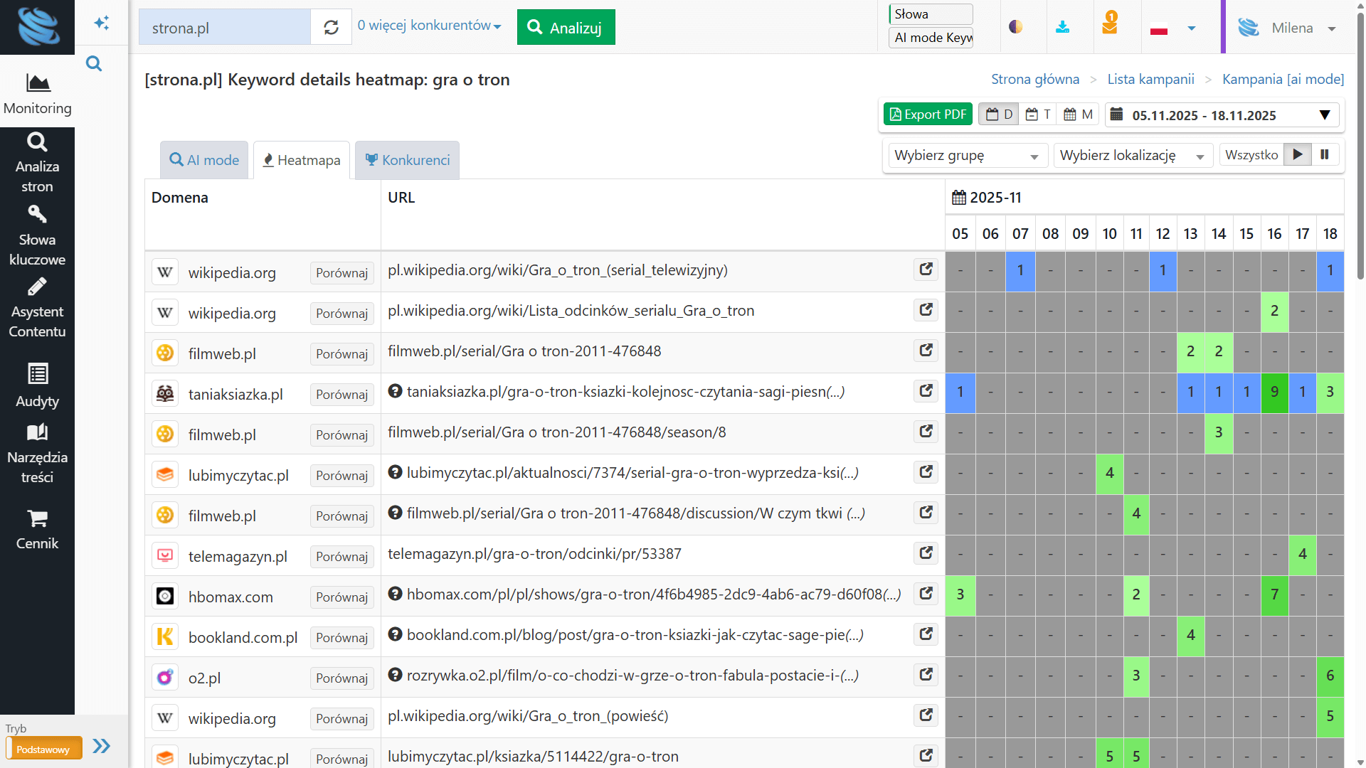 Otrzymasz pełną listę konkurentów widocznych w odpowiedziach generatywnych dla Twoich słów kluczowych. Porównaj ich wyniki ze swoimi i dowiedz się, jakie treści musisz stworzyć, aby zająć ich miejsce.